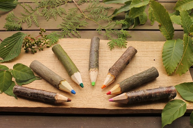 七種類の木の枝を選んで、のこぎりで伐って、ドリルで穴をあけて、好きな色の芯を入れて、最後は削り馬でえんぴつを削ります。木の色や匂い、生木を削る感触を五感で味わってください。お昼ご飯もご用意します。