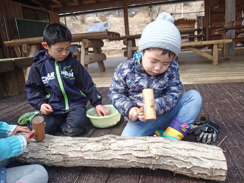 野草を観察後、シイタケとキクラゲの菌のコマ打ち体験を実施しました。
