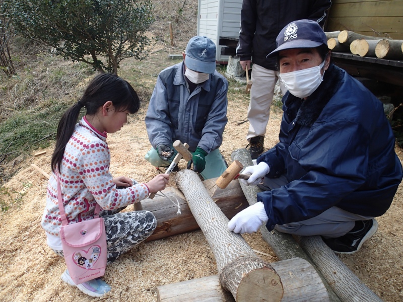野草を観察後、シイタケとキクラゲの菌のコマ打ち体験を実施しました。