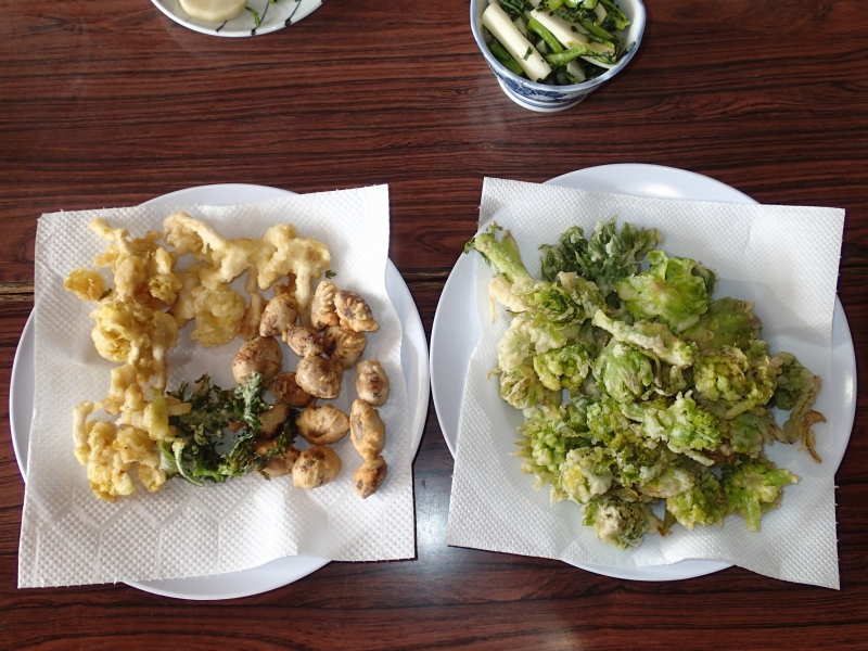野外料理は山で採取したフキノトウと栽培しているシイタケなどの天ぷらを中心に春の山の恵みを存分に堪能しました。