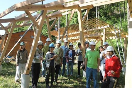 組み立てた骨組みを起こすのも、参加者みなさんの力を合わせて行いました。