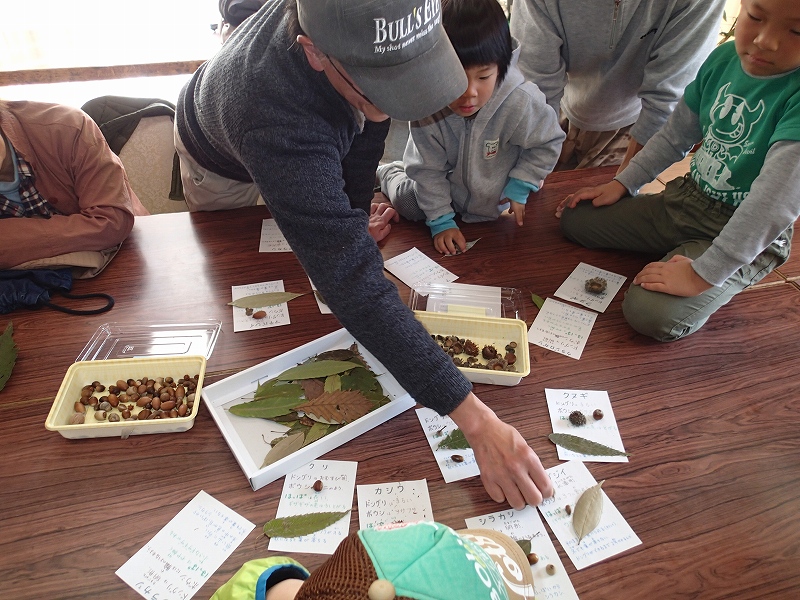 自然観察会テーマ「ドングリころころ」ではいろいろなドングリを拾って違いをしらべます。またドングリでクッキーを作って食べます。