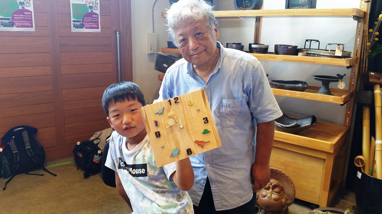続いて、道の駅の特設会場に移動した後、辻又のスギ間伐材で作られた時計の文字盤に、予め加工した文字盤用のパーツを貼ります。