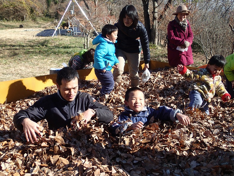山荘周辺の冬景色とその中でひそかに進んでいる春の準備を観察し、途中で落ち葉を集め落ち葉のプールをつくる。