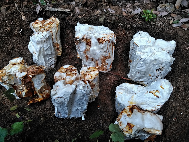 煮沸殺菌した原木にマイタケ菌を接種します。秋には天然舞茸にも劣らない美味しい原木舞茸が採れるはず。原木を煮沸した煮汁を使って草木染め(タンニン染め)も行います!