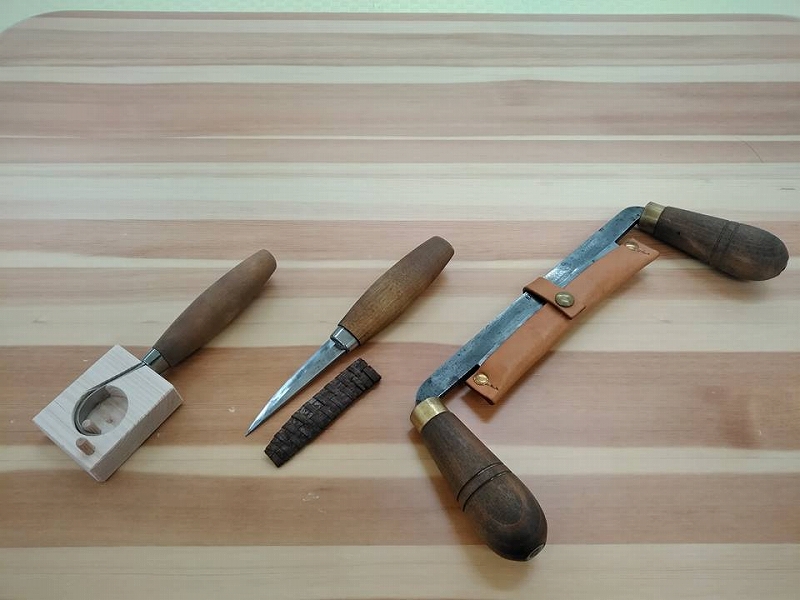 ①銑(せん)(ドローナイフ)の革カバー、②フックナイフの木製ケース、③カービング(ストレート)ナイフの樹皮製カバー、④木工用刃物の研ぎの4コースから2コース選択できます。銑やナイフは当日購入していただくことも可能です。