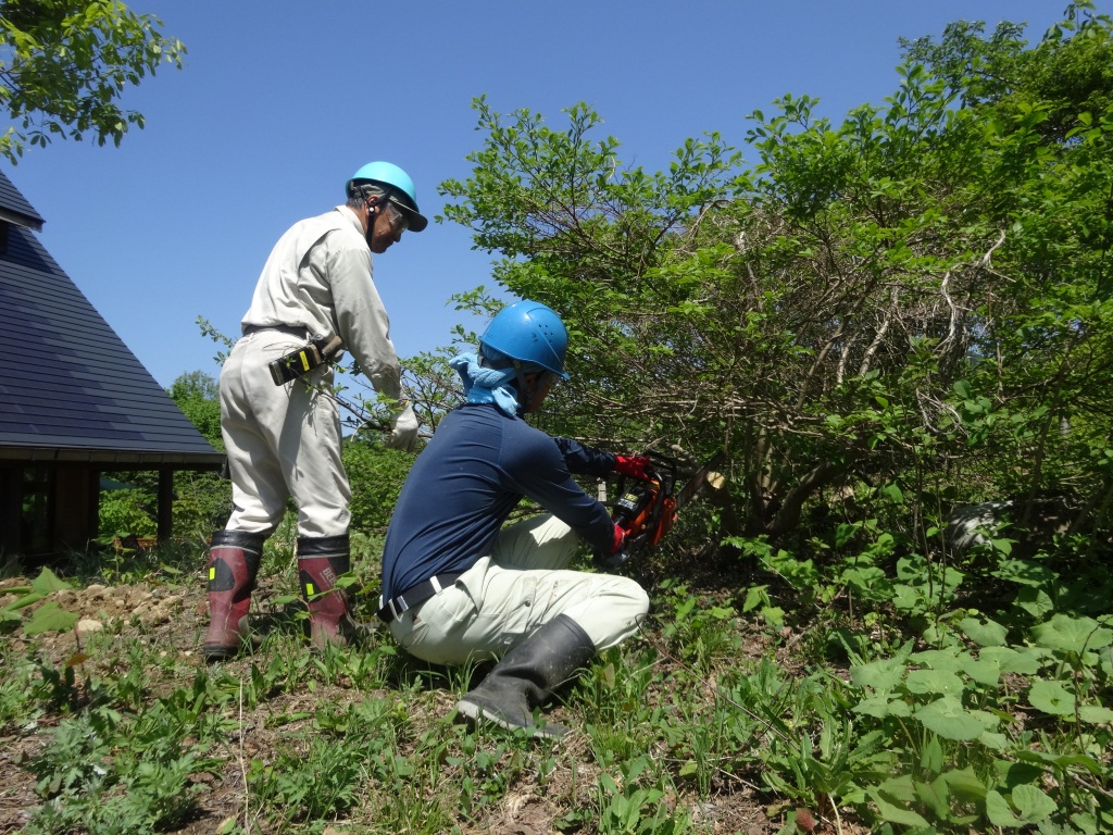 作業員さんの指導のもと、新人スタッフ2名がチェンソーで手際よく切っていきました。