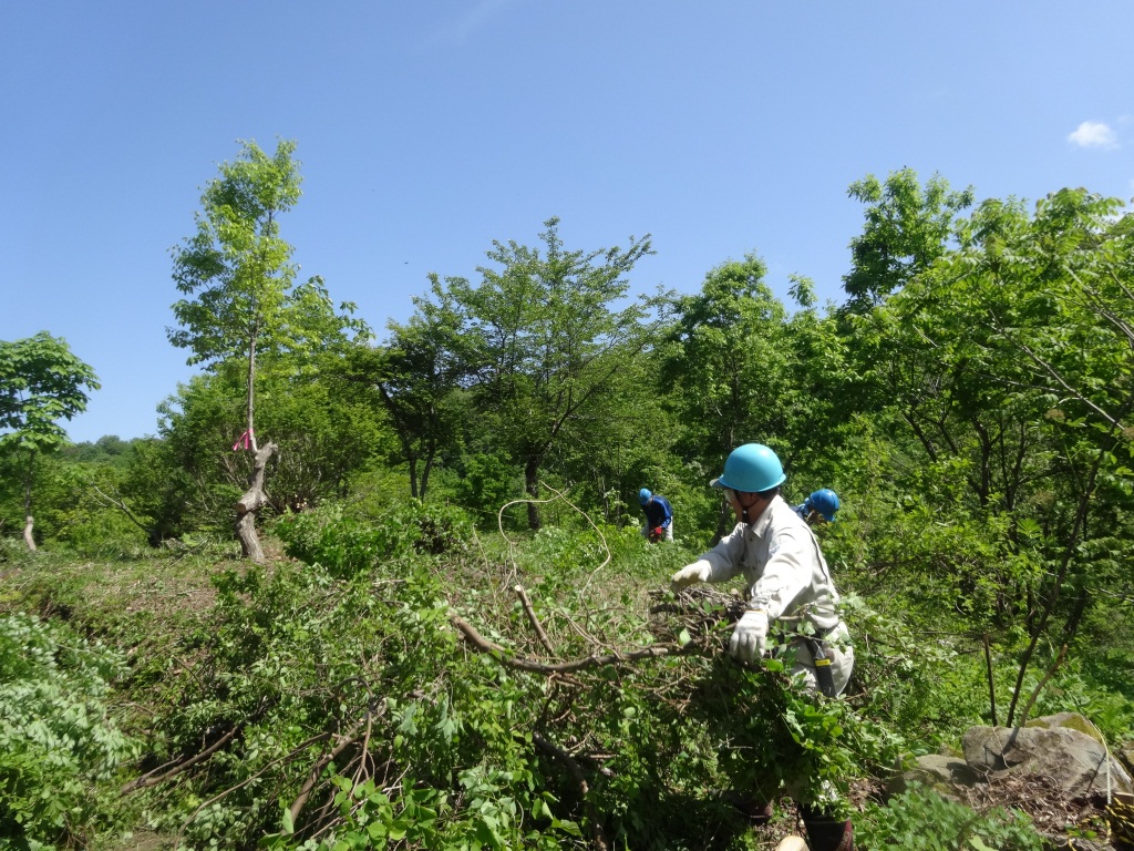 作業員さんの指導のもと、新人スタッフ2名がチェンソーで手際よく切っていきました。