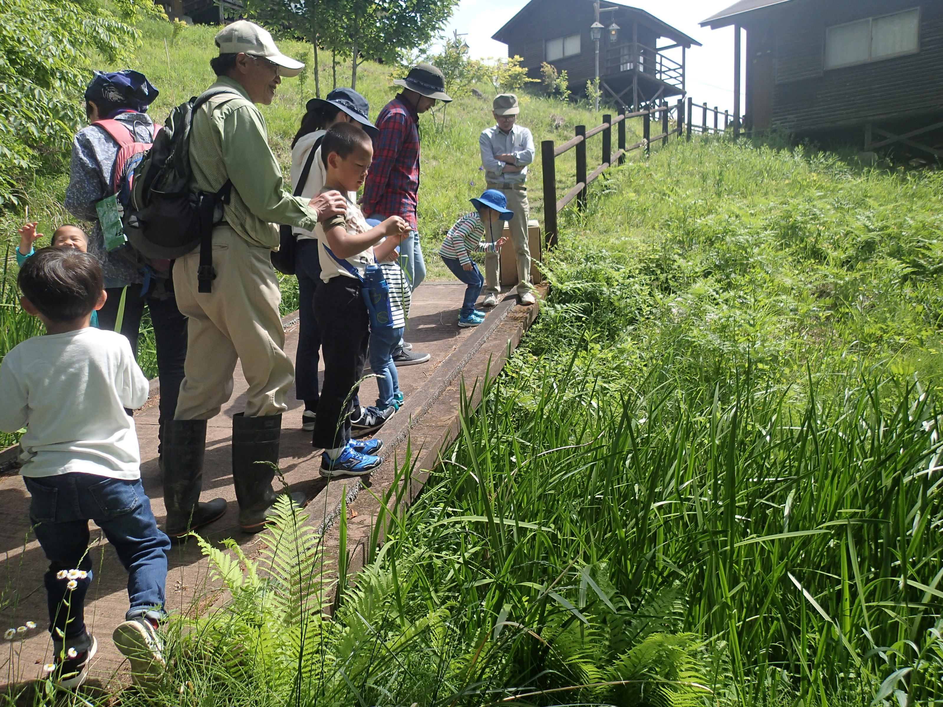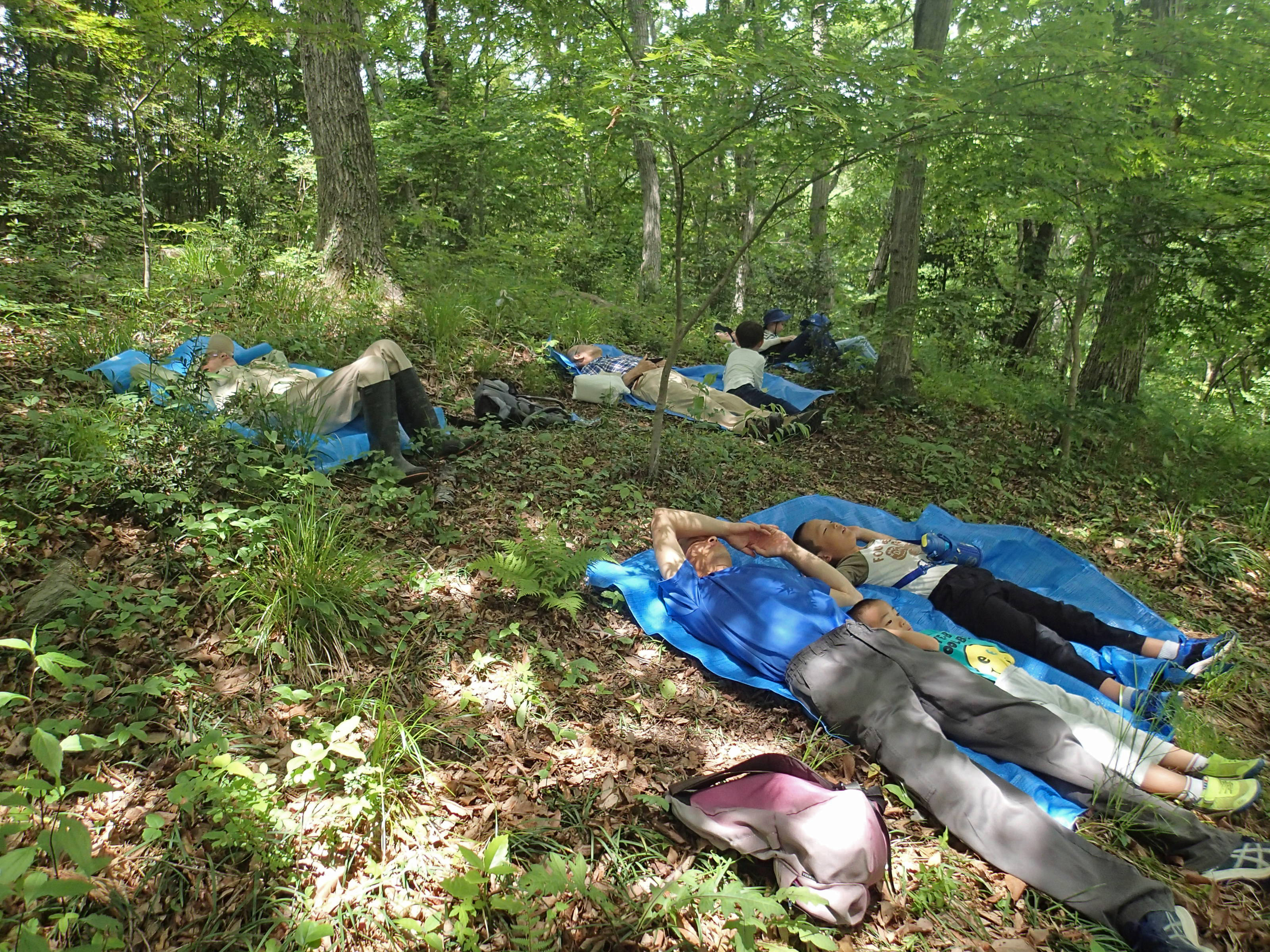 「初夏の森を歩いてみよう」をテーマに2班編成で新緑の森の散策を行いました。自然体験では、森林療法体験をしてもらいました。