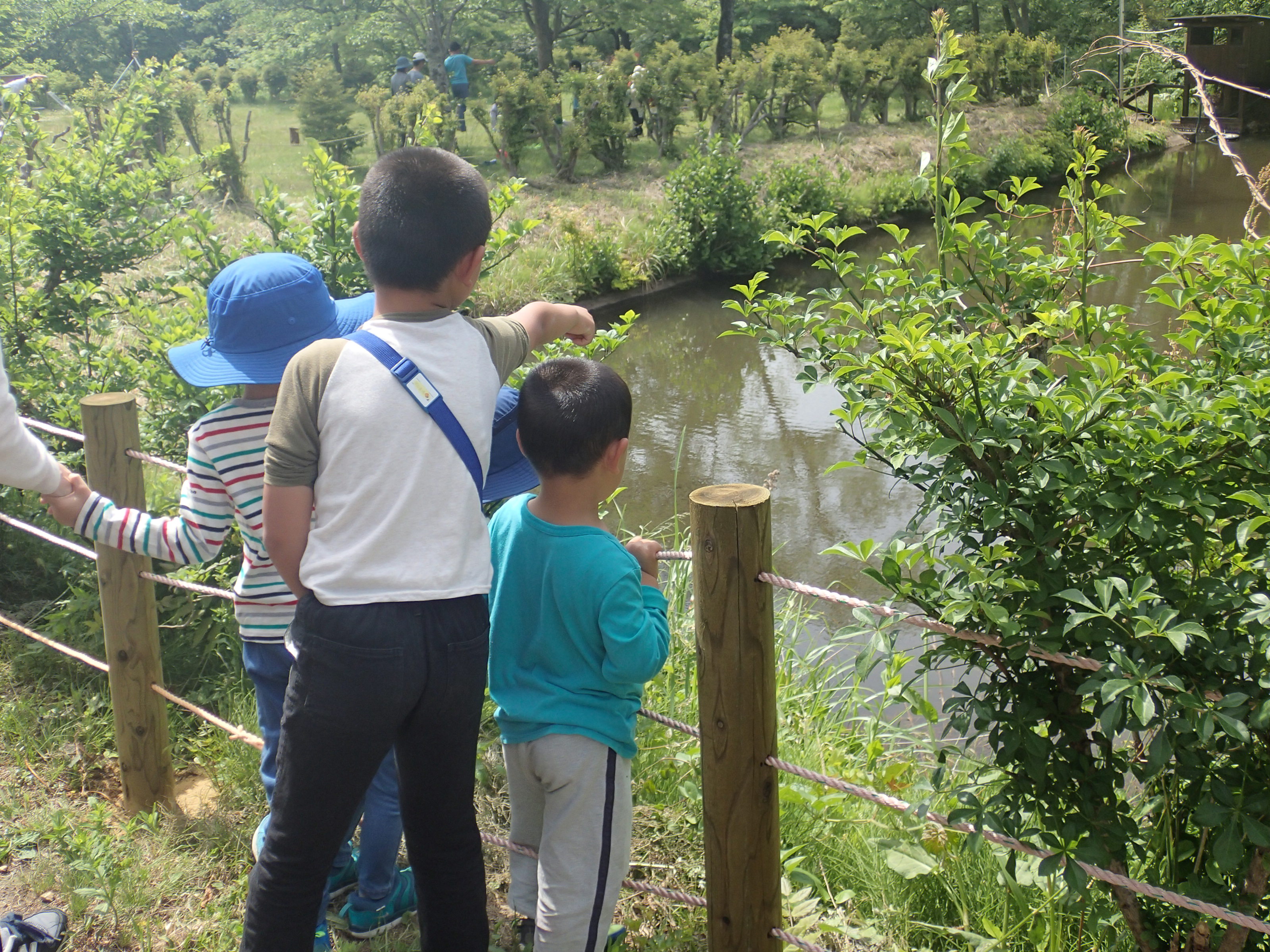 開墾した畑周辺の森の観察。自然体験では、サツマイモの苗を植えました。