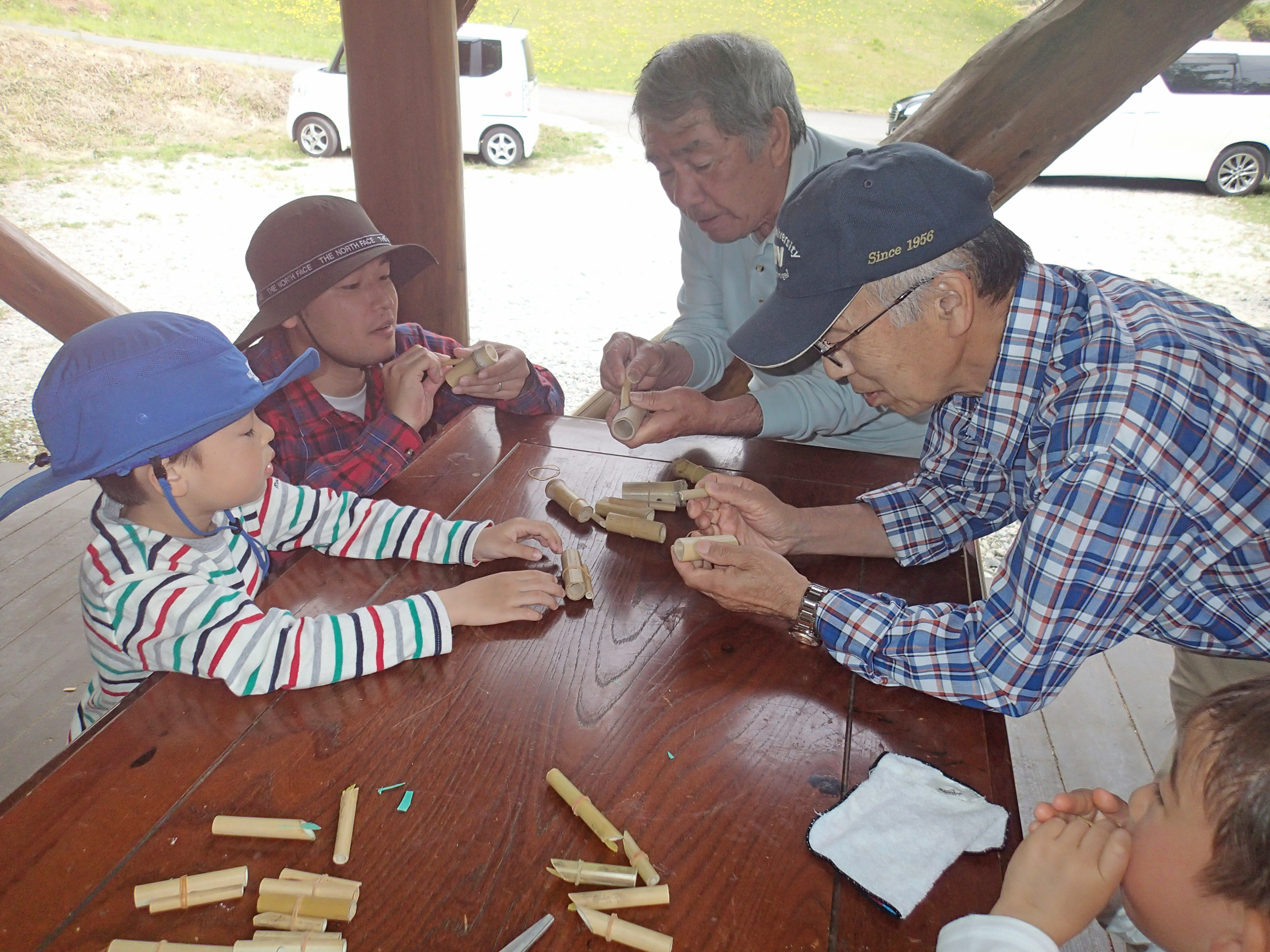木工クラフトは、親子を中心に竹笛とブーブー笛を作りました。