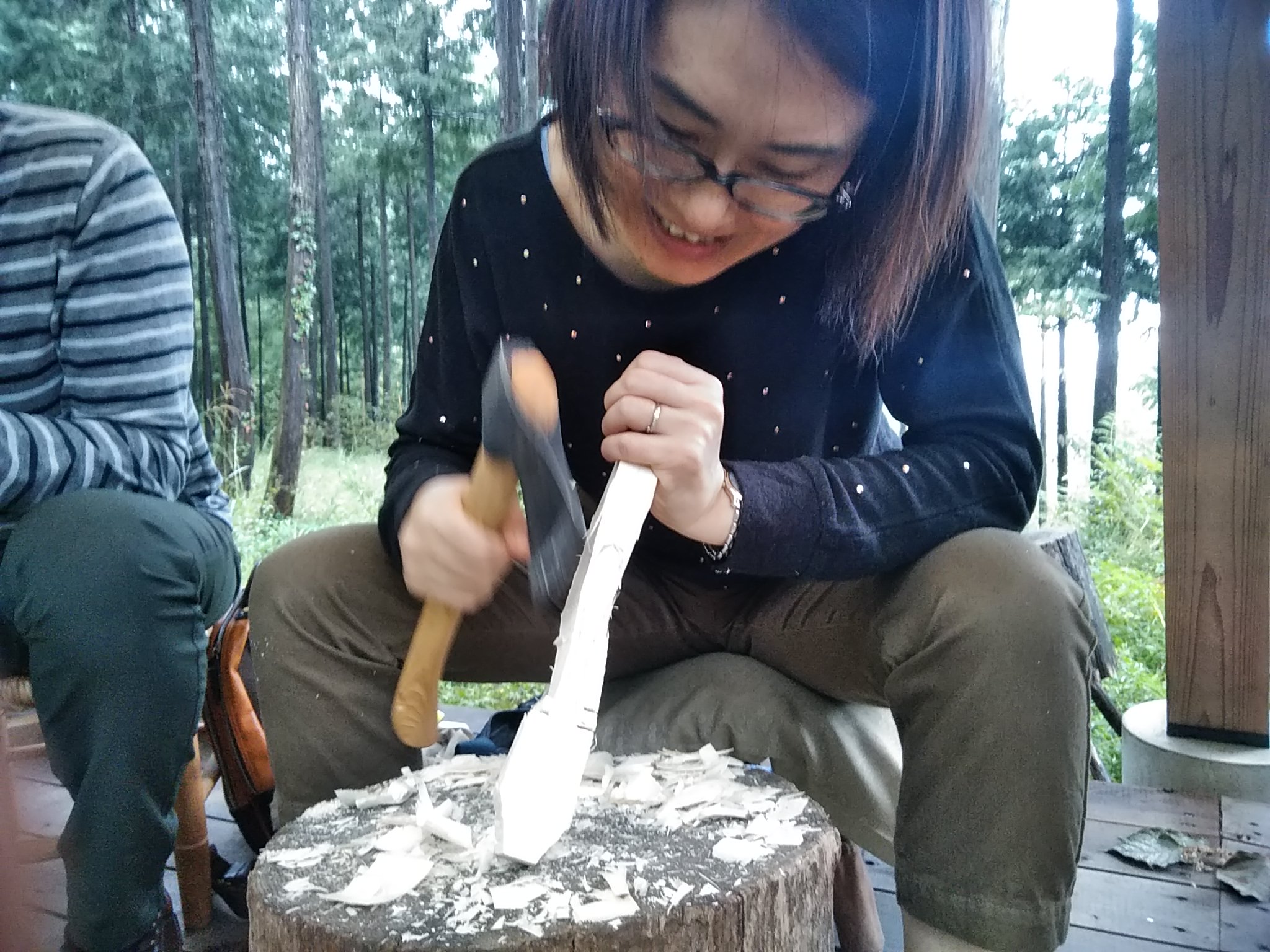 グリーンウッドワークの経験者は数名程度、いくら修行とはいえ、いきなり難しい材では大変なので、この日は削りやすいコシアブラを使ってもらいました。