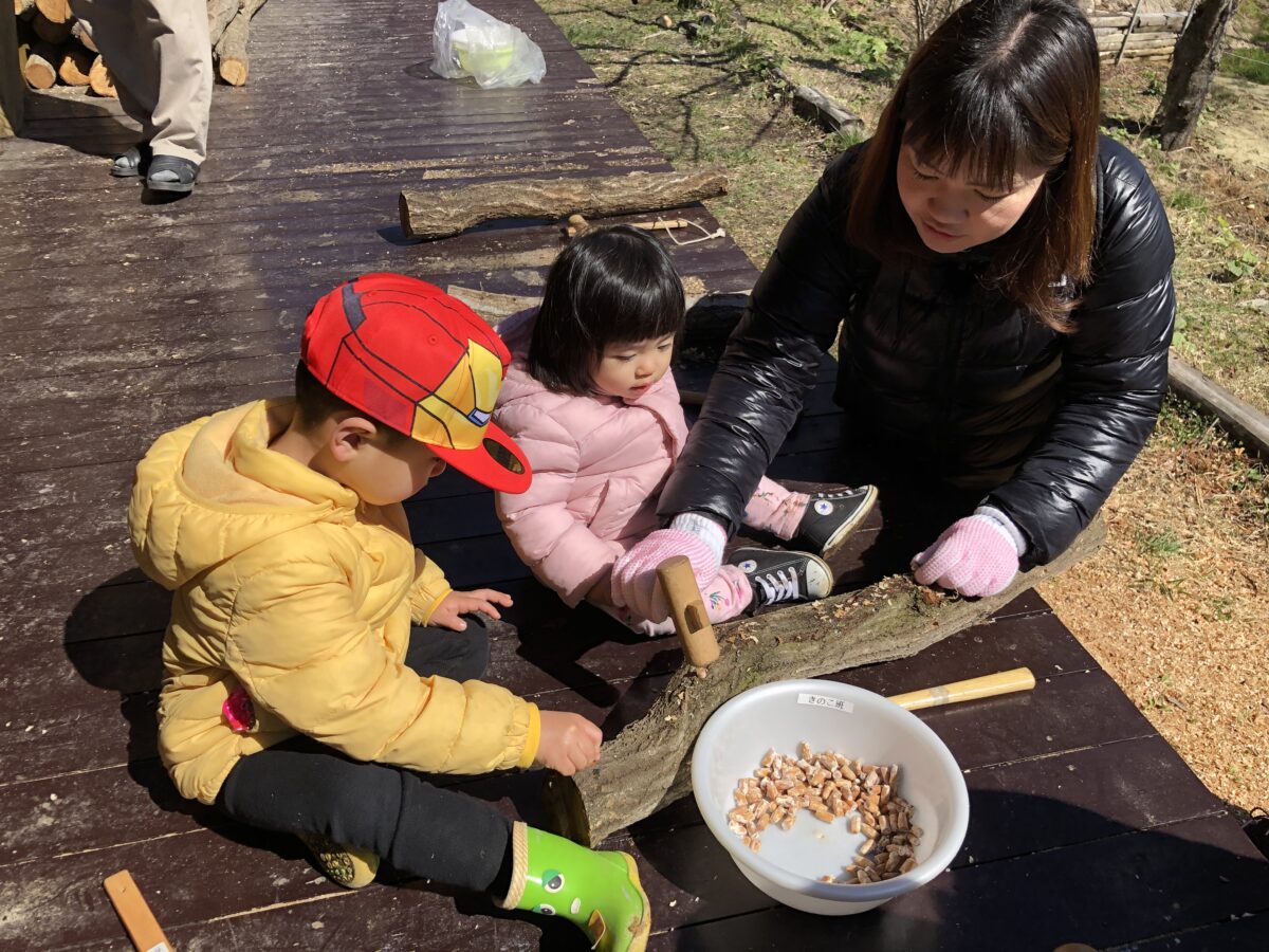 観察会の後、コナラのホダ木にシイタケの植菌作業を体験しました。
