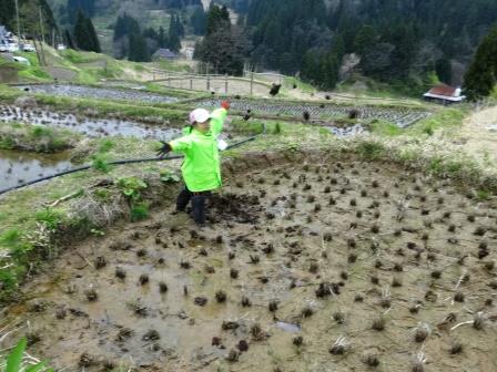 田植えに備え、水が漏れないように畦を打ち、また稲が良く育つよう、中ノ俣産の牛糞で作った堆肥をまきました。
