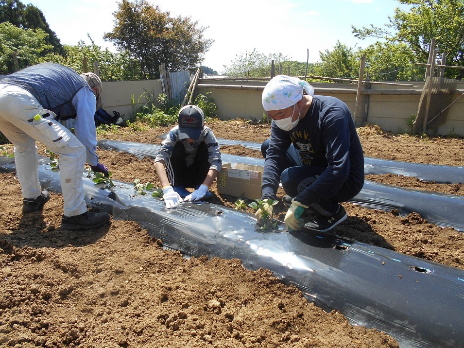 開墾した畑周辺の森の観察。自然体験では、サツマイモの苗を植えました。木工クラフトは、親子を中心に竹笛とブーブー笛を作りました。