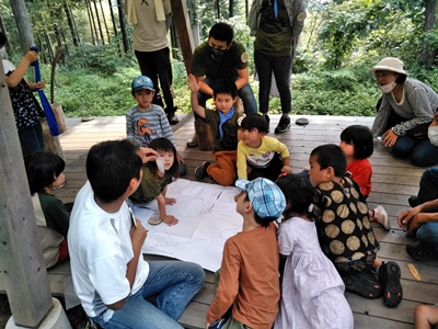 ノコギリで竹の伐採、ナイフで箸づくり、夜の森探検、テントのお泊り、思いっきり虫探し。