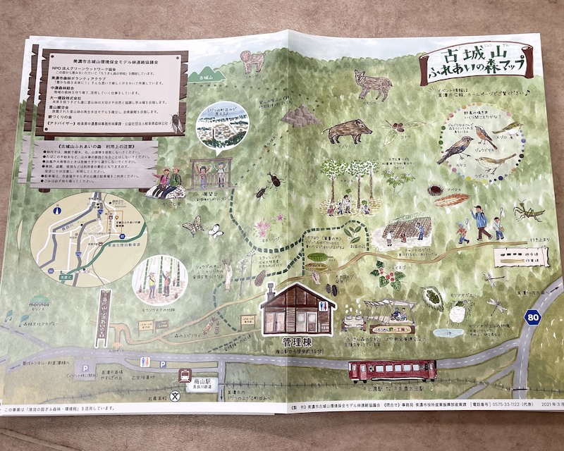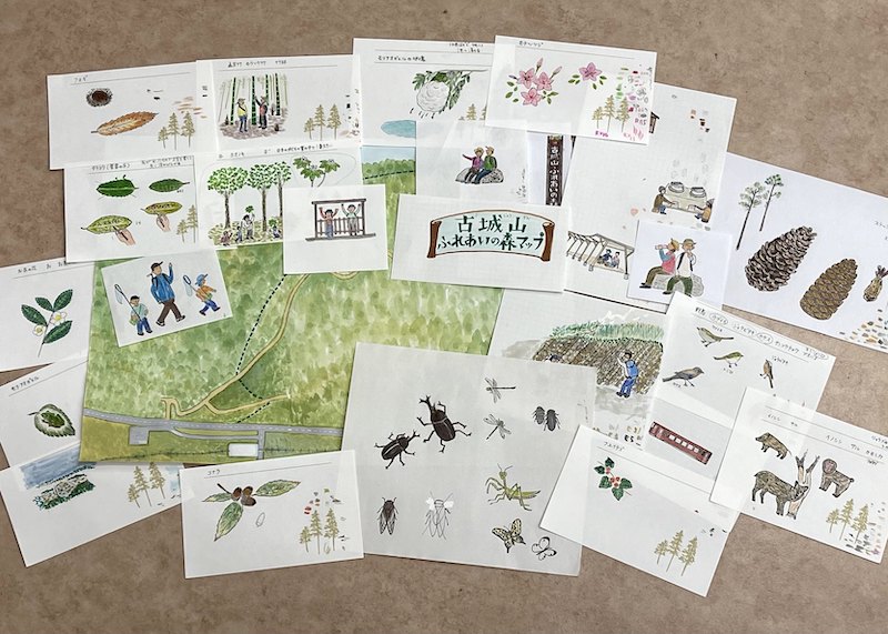参加者のみなさんが心とからだを使って見つけた古城山ふれあいの森び魅力をまとめたものを、イラストレーターさんに書きおこしてもらいました。