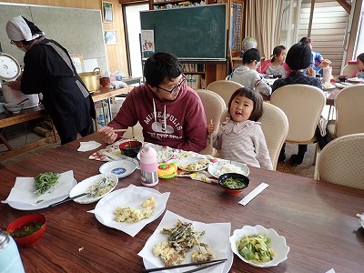 4,野外料理体験→タケノコとヤマウコギのまぜごはん、シイタケ、ヨモギ、ワラビ、コゴミ、タケノコ等の天ぷら、みそ汁いただきました。
