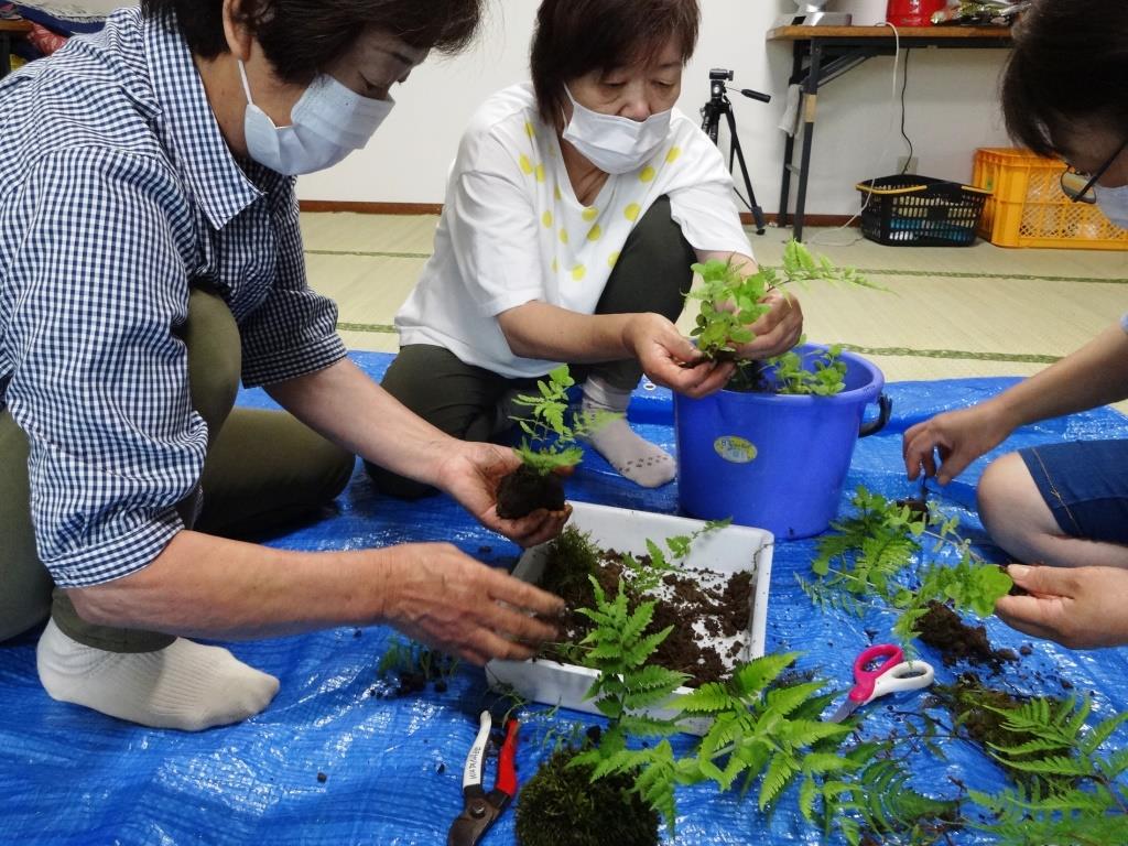 会場の周囲には、材料となるシダ植物や苔がたくさんあり、それぞれの好みの形に仕上げました。
