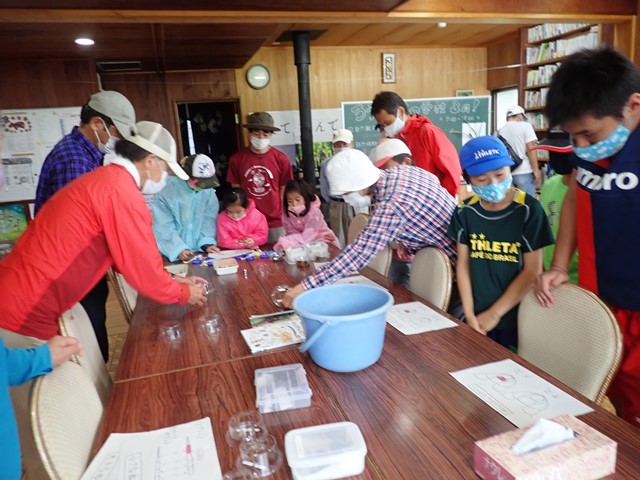 自然観察会は、はじめに屋内でセミの種類や雄雌の違いを確認したあと、山荘周辺の森で抜け殻を探しました。