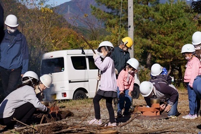まずは山に入って火起こしできる材料を拾うところからの火起こし体験。