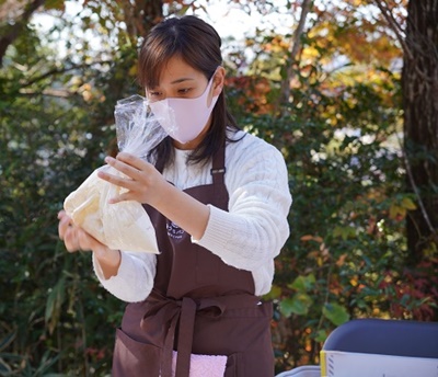 レンガでかまどを作り、マッチ3本内で火を起こしてお湯を沸かしたら、袋でのご飯炊きや防災パンづくり。