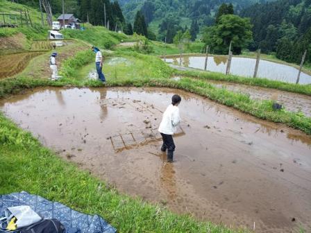 1日体験の参加者も加え、子どもも含め大勢で田植えを行いました。