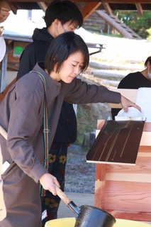 醤油ってこんな風に搾るんだ、結構醤油作るのも大変なんだという感想が聞こえたり、子どもたちが搾り舟にべったりで醤油をずっとなめていたりしていました。