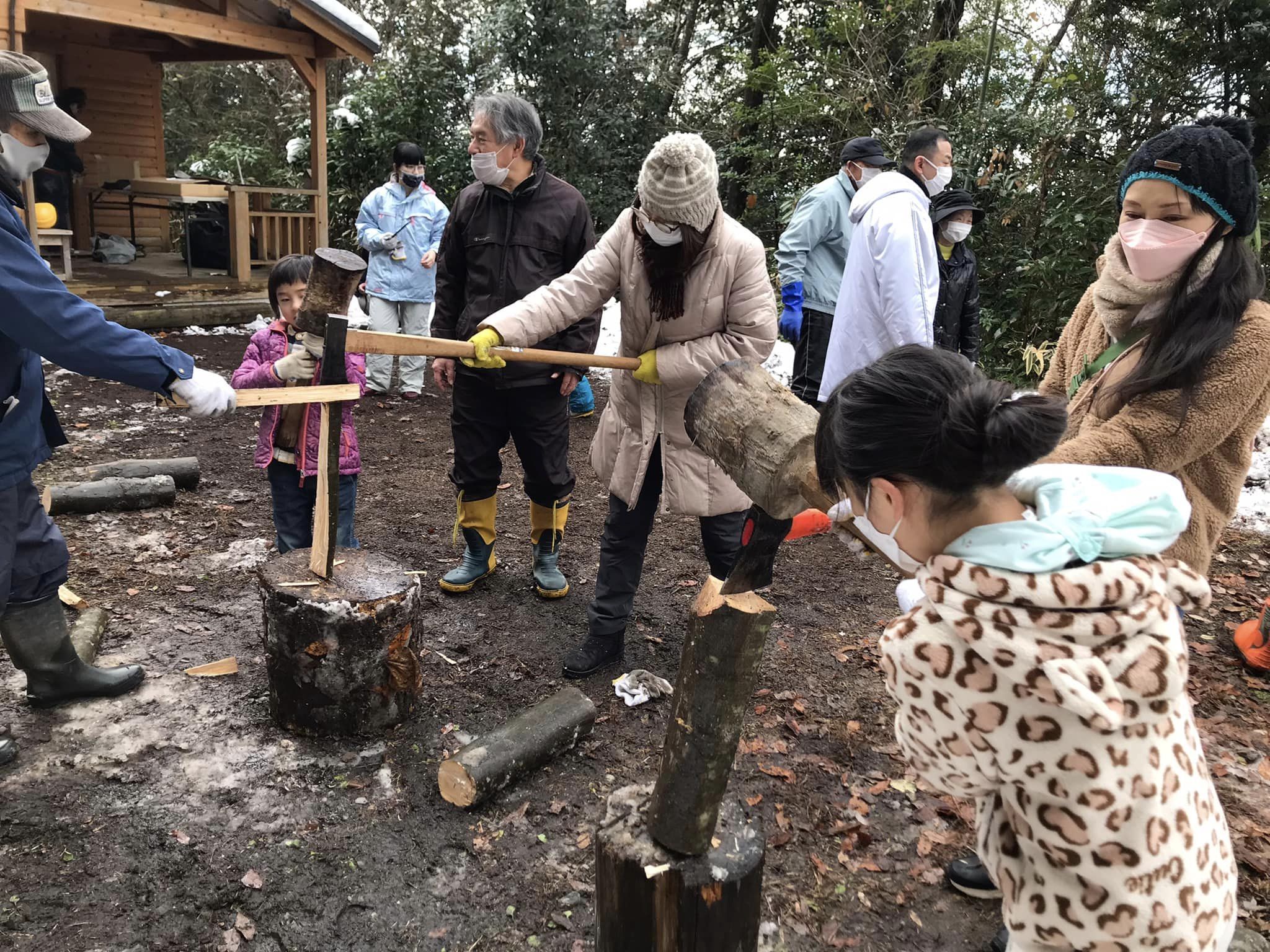 前日積もった雪の中大きなコナラを伐倒したり、事前に伐り倒しておいた小径の樫の木を薪割り用の斧と木槌を使って炭焼き用の材を小割りにします。
