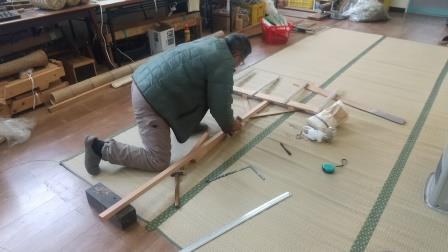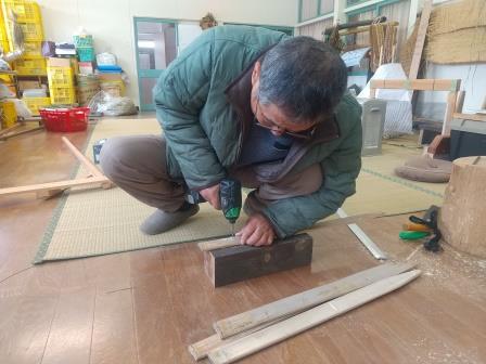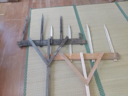 およそ30cmの幅を保ちながら、真っ直ぐ線を引くための道具ですが、地域の方から譲ってもらったものは長年の間に欠けたり壊れたりしてしまったので、今回、竹と材木で作りました。