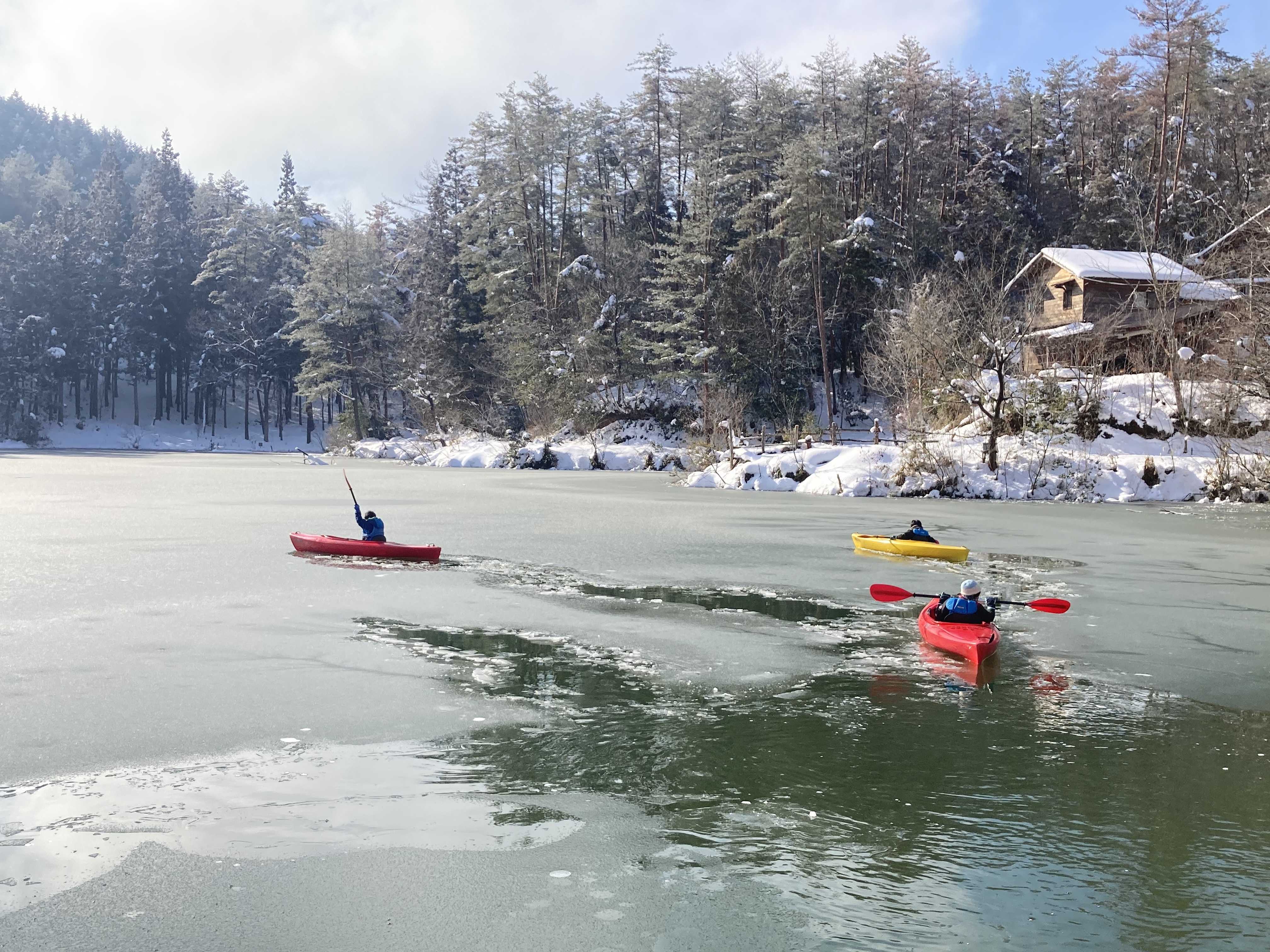 凍った万代池にカヌーを浮かべて過ごしてみたり、雪を焚き火の中に入れてみたり、滑りやすい坂を探して滑ってみたり…