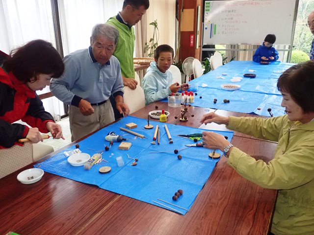 雨のため、自然体験活動「サツマイモ掘り」は中止となりましたが、「どんぐり」をテーマに、自然観察会や木工クラフトを実施しました。