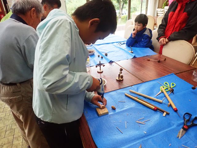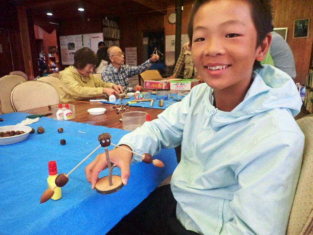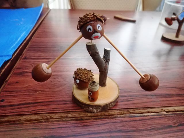 木工クラフトでは「どんぐりのやじろべえ」を作りました。