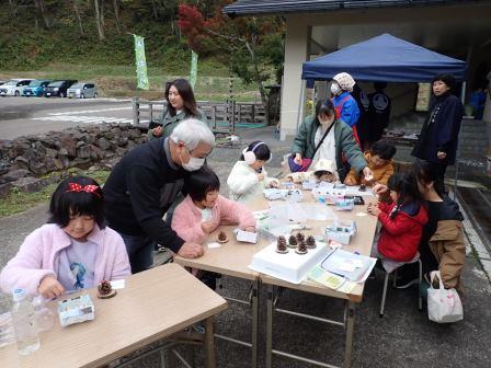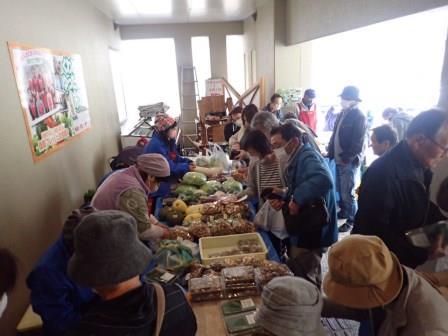 湯ったり村では野菜やキノコ、加工品の販売や木工作体験、潮陵中学校の生徒によるお楽しみコーナーで人が賑わいました。