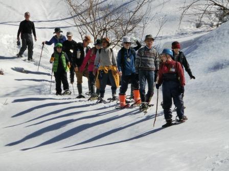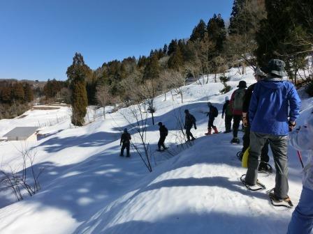 雪は少なめでしたが、山かんじきを履き、林を抜け、棚田をぐるっと一周するコースを巡りました。
