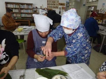 ちまきはササを2枚使って作るのですが、1枚目のササをろうと状に巻くのが難しかったようです。
