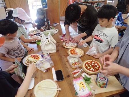 お昼はピザ焼き体験!自分で生地に具材を盛り付け、焦げないように窯で回しながら焼いていきます。