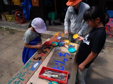 午後はもりっちの看板作りと水遊び。板に絵の具で看板を描き、乾いたらもりっちの活動場所に飾る予定です。