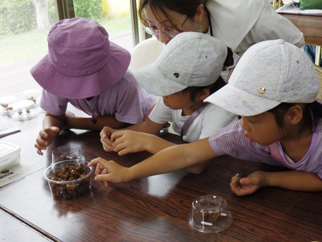 はじめにセミの種類やセミの一生について学んだあと、セミの抜け殻集めに出かけました。