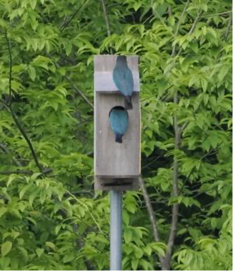 ブッポウソウがゲッゲッとさかんに鳴いて、巣箱を物色中。なんと2羽で。夕方の帰宅時に、とうとう1羽が巣箱に入るのが見えました。