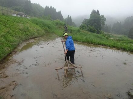 (5/22)東京から農業実習で上越市を訪れている社会人の方がサポーターに参加してくれました。膝まで埋まるほどの深い田んぼです。