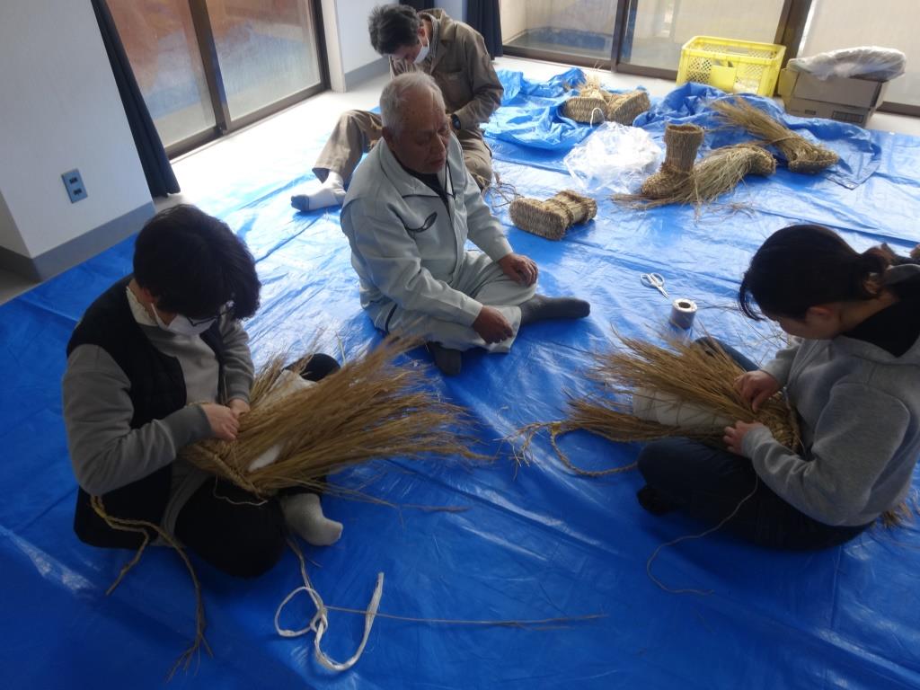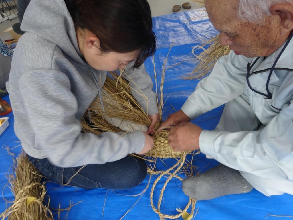 ろうきん森の学校新潟支部・かみえちご里山ファン倶楽部で開催された4月の「ちょいワラ体験会」。ワラ細工を通して、伝統技術や生活技術を学びます。