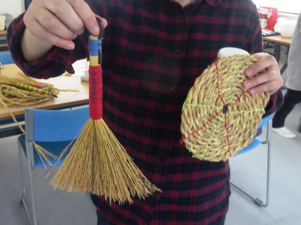 初心者コースは、わらの「みご(実が付いている部分)」を集めてミニホウキを作ったり、なわないを練習したりしました。