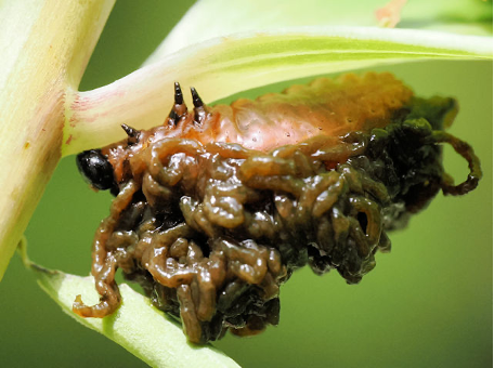 6/12 ササユリの葉を食べて、自らの糞を身にまとう(!)ユリクビナガハムシを発見。