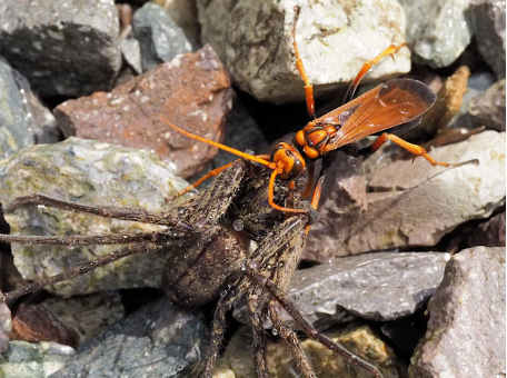 7/10 ベッコウクモバチ シャワー室横の切り通しに メスがコアシダカグモを運搬