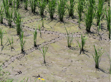 7/10 中干し中の水田に、ステッチを描くカメの足跡(奥)と大きなサギの足跡(手前)