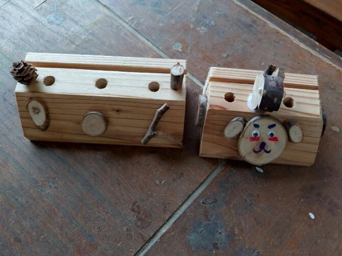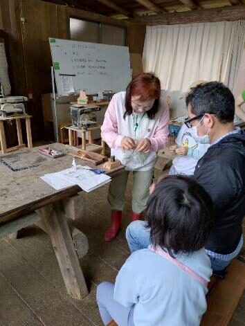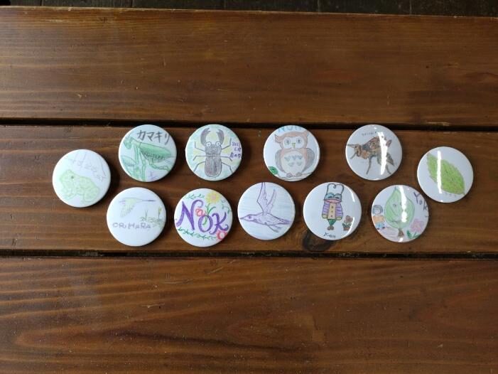 工房内で、木のメモ立てを作成したり、自分で描いた自然の絵からオリジナル缶バッジを作成。
