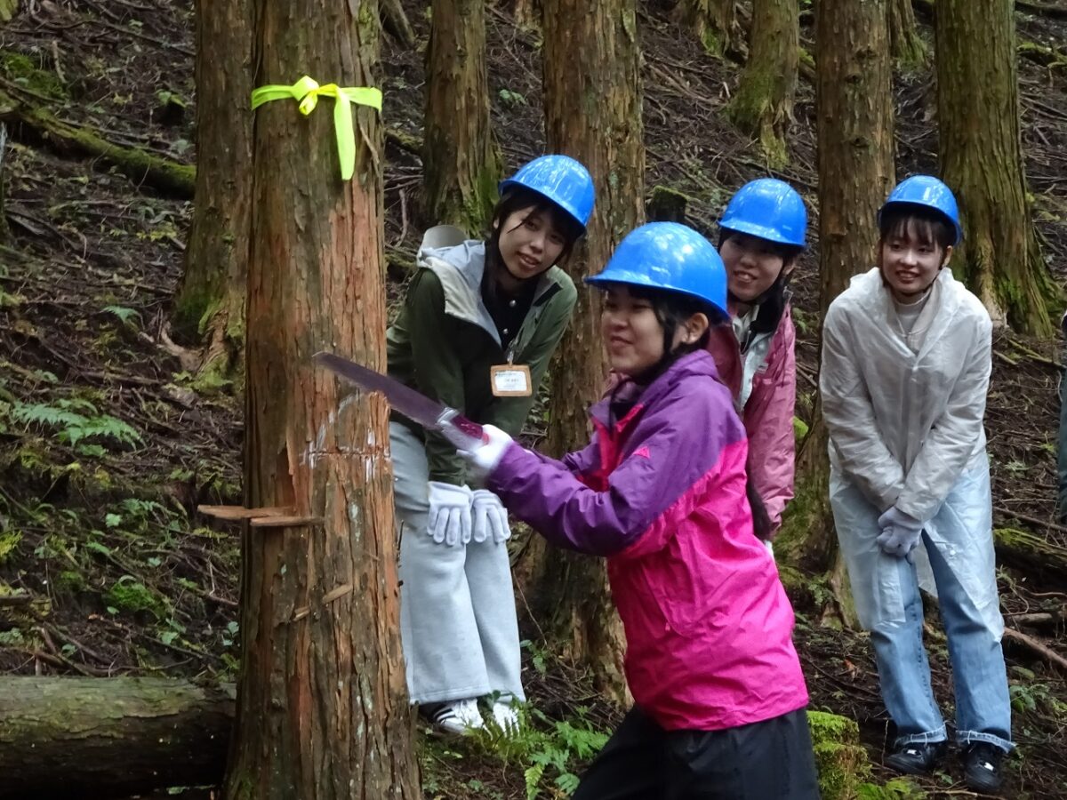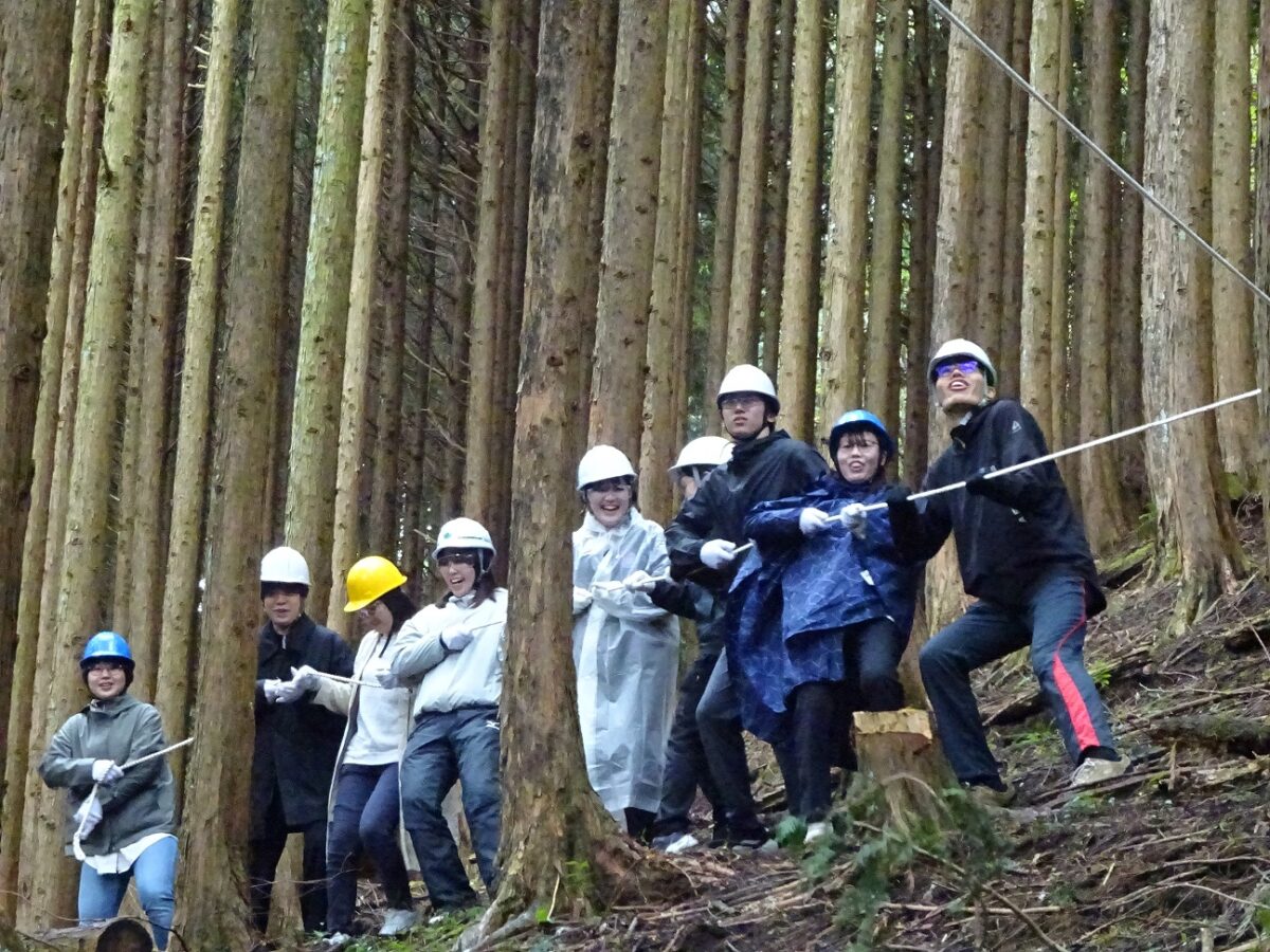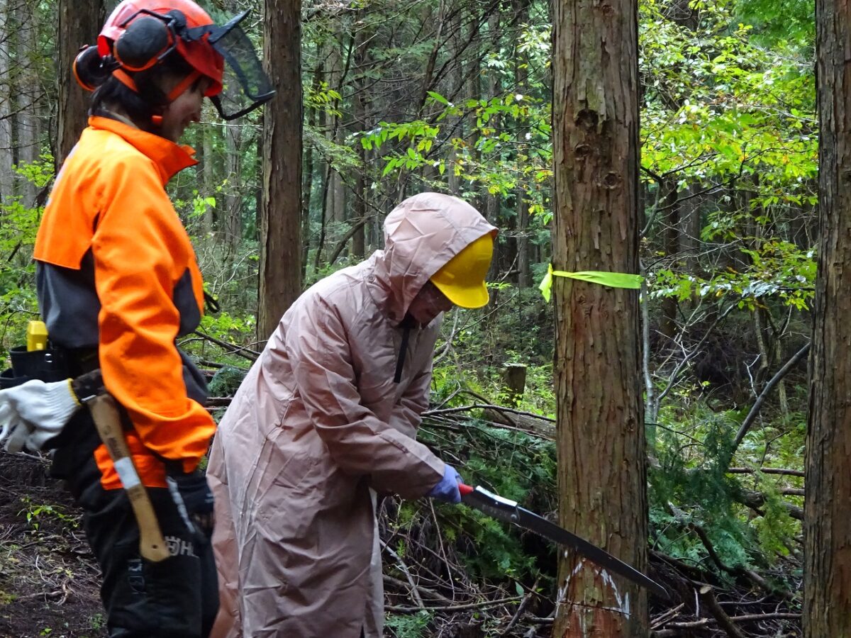 ホールアース自然学校が管理する人工林を舞台に、労働金庫連合会の新入職員に向けて間伐体験を実施しました。冒頭、日本が抱える人工林の課題や間伐の意義を説明した後、人工林に移動し、3グループに分かれそれぞれ1本ずつヒノキを伐り倒してもらいました。途中、なかなか倒れない場面もありましたが、力を合わせてやりきることができました。普段は別々の部署で働く同期が一堂に会する久しぶりの機会でもあり、交流を深めてもらうきっかけになったようでした。