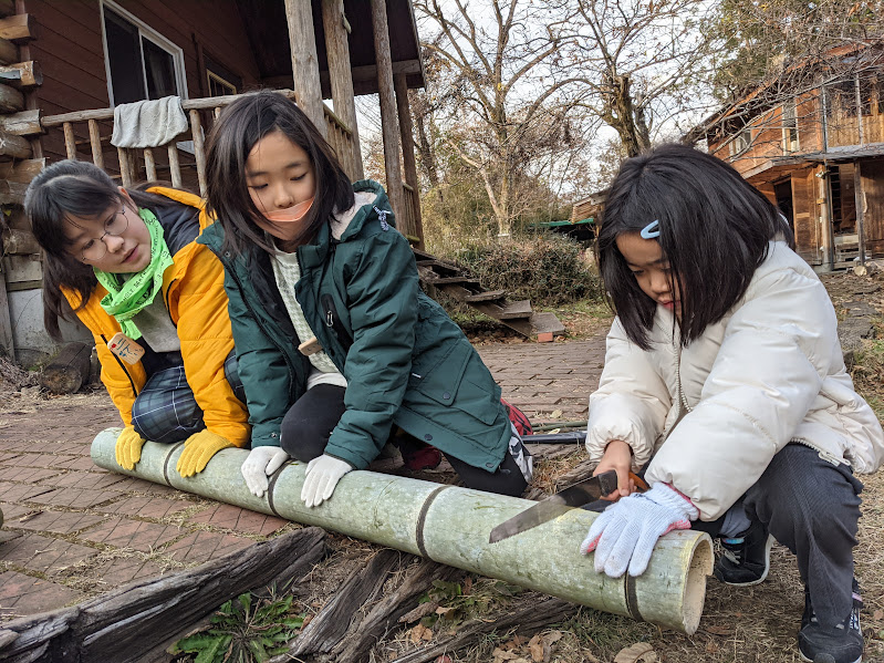 もうすぐお正月キャンプ 敷地内に生えているシノダケと地域の方が所有する竹林から竹を採取し、門松 づくりを実施。 子どもたちは太い竹を好きな長さに切り、ナンテン(葉・実)や地面に落ちている スギの葉、クルミの実などの自然物や折り紙を使って飾り... -